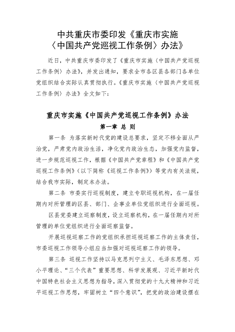 中共重庆市委印发《重庆市实施〈中国共产党巡视工作条例〉办法》